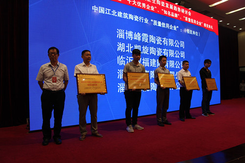9月5日,2015中國建筑衛(wèi)生陶瓷發(fā)展趨勢研討會暨首屆中國江北建陶行業(yè)“十大優(yōu)秀企業(yè)”、“知名品牌”、“質(zhì)量信用企業(yè)”頒獎典禮在淄博市淄川區(qū)人民禮堂召開。本次活動由中國建筑衛(wèi)生陶瓷協(xié)會陶瓷板分會、國家陶瓷及衛(wèi)浴產(chǎn)品中小企業(yè)服務(wù)示范平臺主辦。中國建筑衛(wèi)生陶瓷協(xié)會常務(wù)副會長繆斌,秘書長呂琴,中共淄博市委常委市委政法委書記韓國祥,淄川區(qū)區(qū)委書記楊洪濤、區(qū)長李新勝,咸陽陶瓷研究設(shè)計院院長梁振海及全國各地建陶產(chǎn)區(qū)企業(yè)代表、專家、學(xué)者和獲獎單位代表300余人參加了本次研討會暨頒獎典禮。 淄博市淄川區(qū)區(qū)委書記楊洪濤為大會致辭,中國建筑衛(wèi)生陶瓷協(xié)會副秘書長、陶瓷板分會秘書長徐波介紹了分會工作,與會專家、企業(yè)代表進(jìn)行了交流互動。 會上對2015首屆中國江北建筑陶瓷行業(yè)“十大優(yōu)秀企業(yè)”、“知名品牌”、“質(zhì)量信用企業(yè)”進(jìn)行了表彰和頒獎。山東統(tǒng)一陶瓷科技有限公司、臨沂市奧達(dá)建陶有限公司等10家企業(yè)被評為2015首屆中國江北建筑陶瓷行業(yè)“十大優(yōu)秀企業(yè)”,“瓦倫蒂諾”、“米羅印象”等20個陶瓷品牌被評為2015首屆中國江北建筑陶瓷行業(yè)“知名品牌”,淄博獅王陶瓷有限公司、沈陽新王者陶瓷有限公司等20家企業(yè)被評為2015首屆中國江北建筑陶瓷行業(yè)“質(zhì)量信用企業(yè)”。 (獲獎企業(yè)名單見附件)